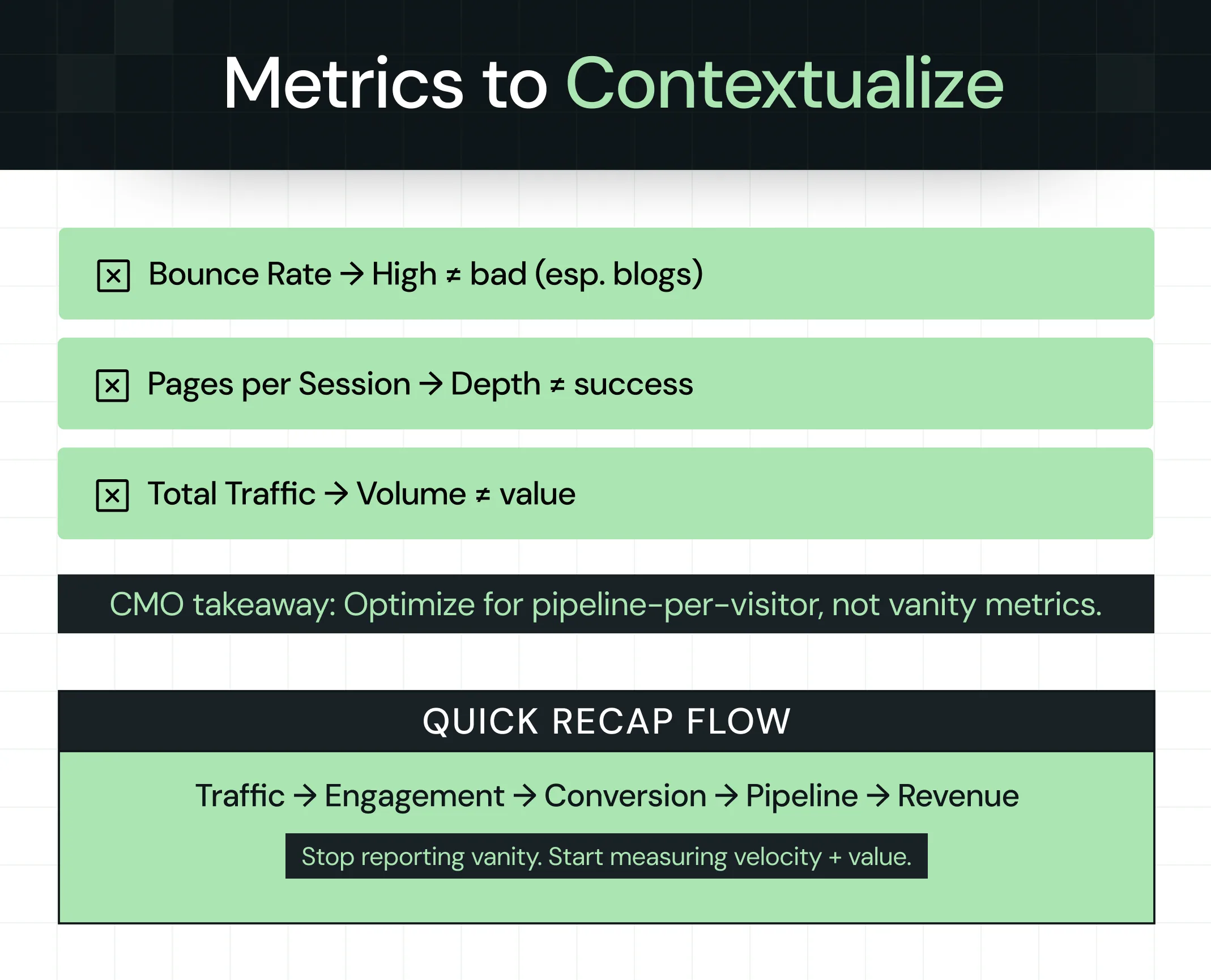 Traffic without conversion context is just noise. A CMO who doubled traffic but halved conversion rate is actually moving backward, not forward. Yet this happens constantly.