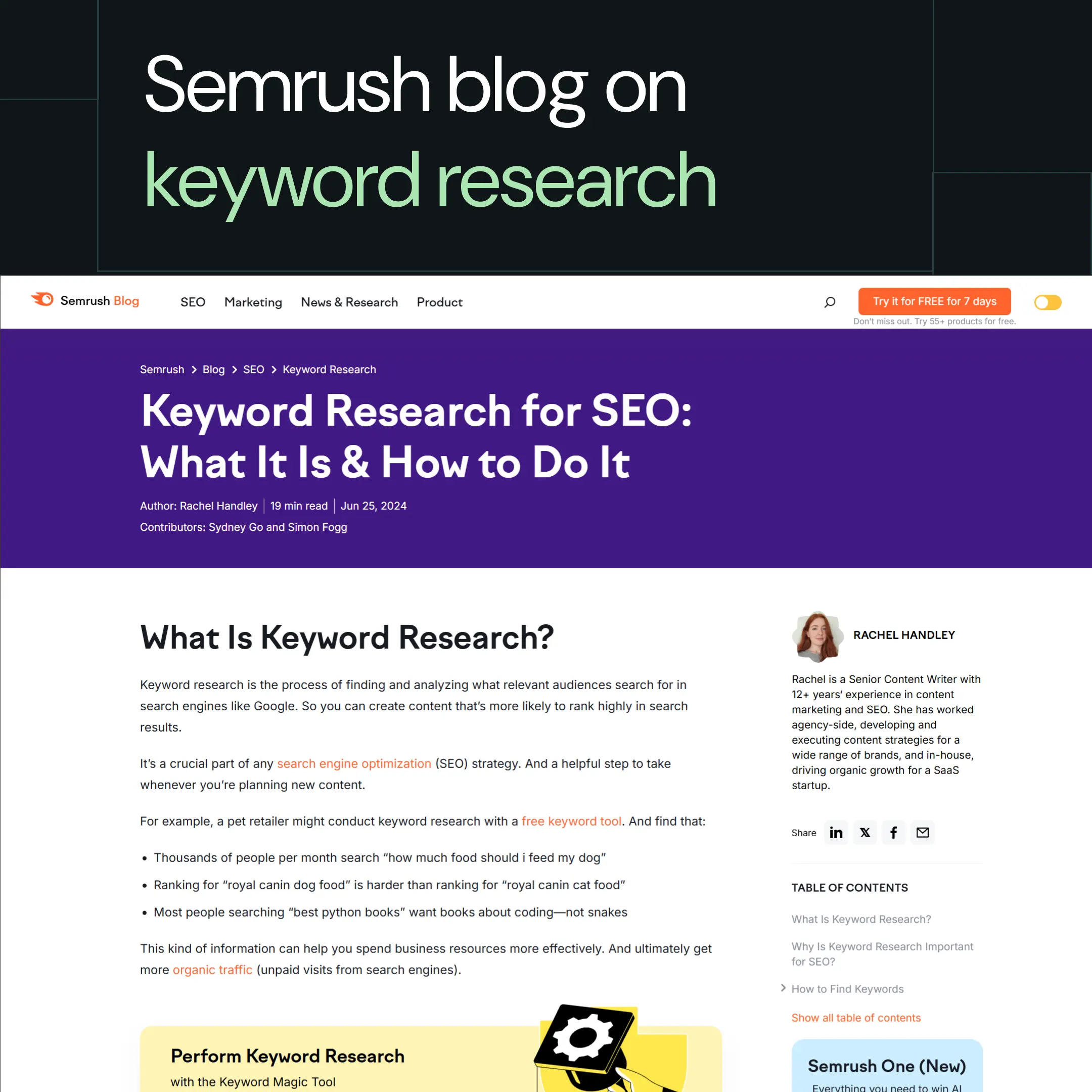 Semrush nails the art of contextual, cluster-based CTAs. In their blog "Keyword Research for SEO: What It Is and How To Do It?", they use a sticky sidebar CTA "Find Keyword Ideas in Seconds," that leads directly to their free Keyword Research Tool.