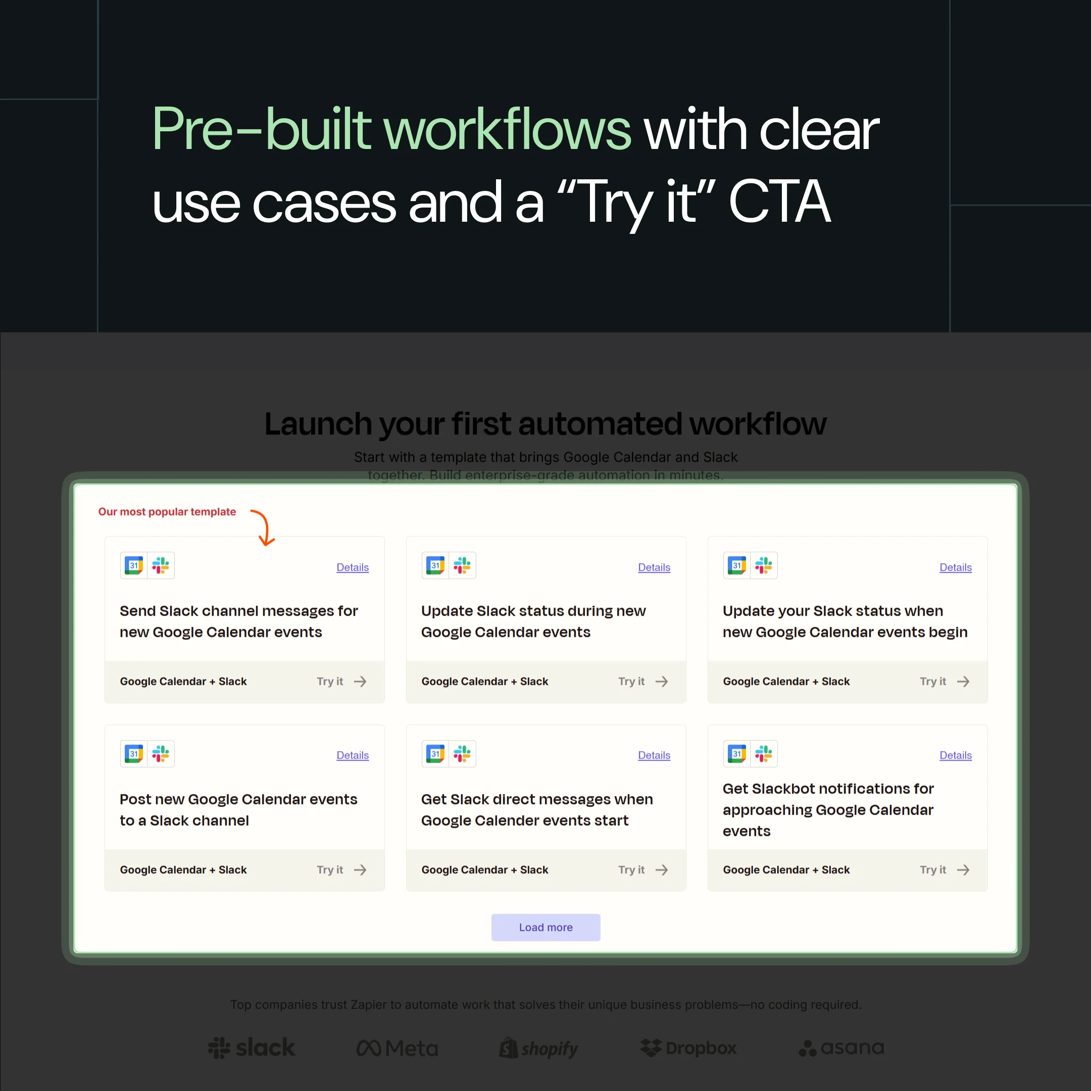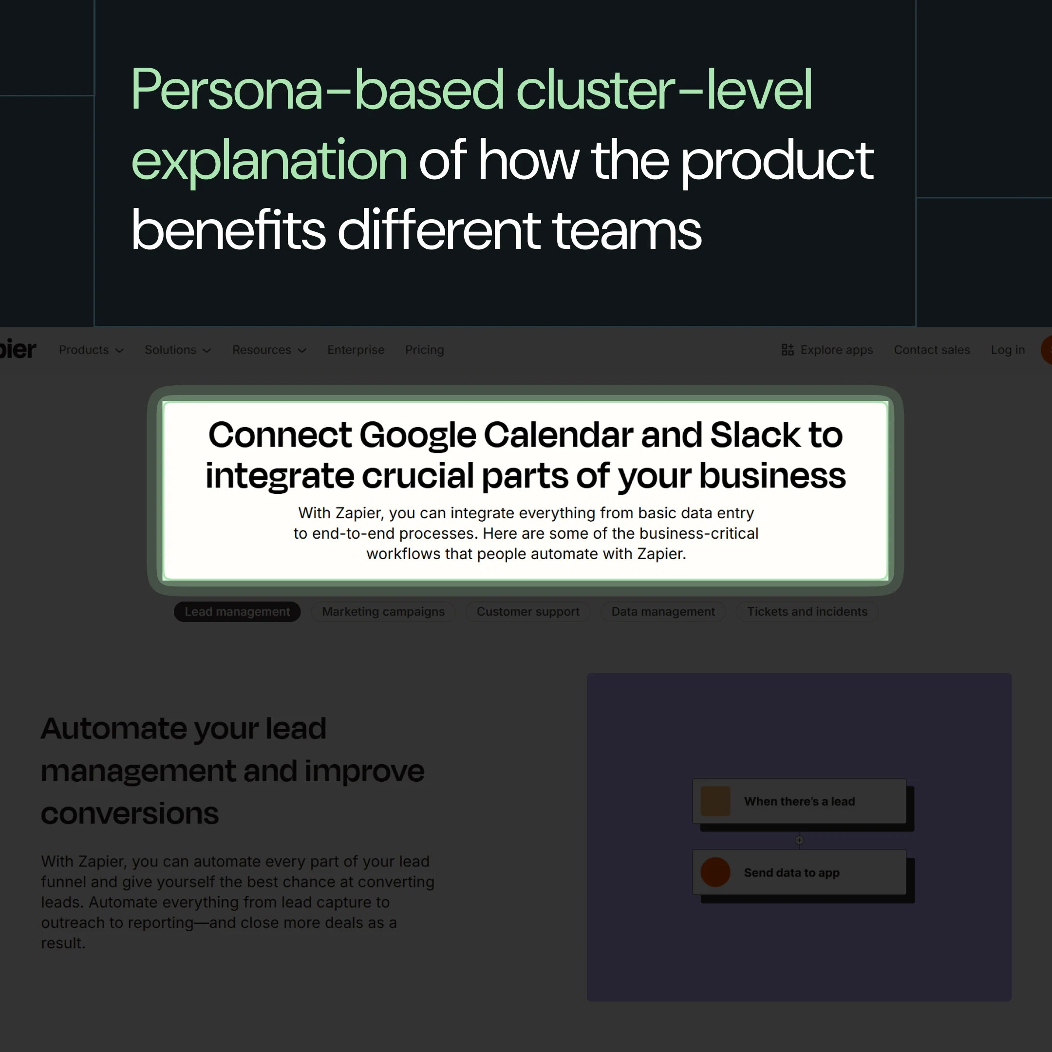 Zapier is a brand that understands this. They know that someone searching "how to connect Slack with Google Calendar" is actually looking for ways to connect them. Instead of educational blog posts, Zapier directs users to integration-specific landing pages that treat the product as the solution to the search query.