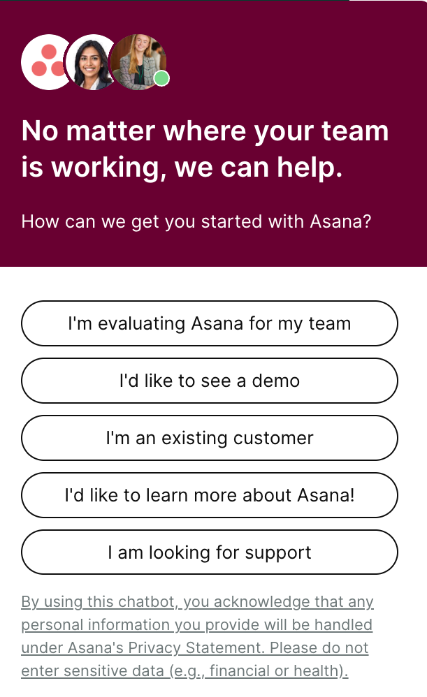 Asana's chat widget eliminates the guesswork. Instead of making visitors navigate through menus, it asks one simple question: "How can we get you started with Asana?"