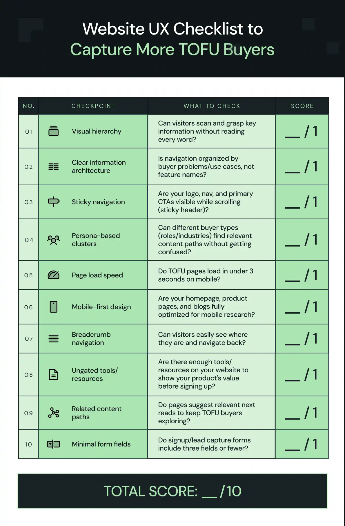 Start by auditing the basics first. Use the self-scoring checklist to see if your current B2B website messaging and UX strategies are strong enough to move TOFU buyers across the funnel. Once they are dialed in, layer on advanced tactics like contextual CTAs (easiest of the lot) or intent-based onboarding.