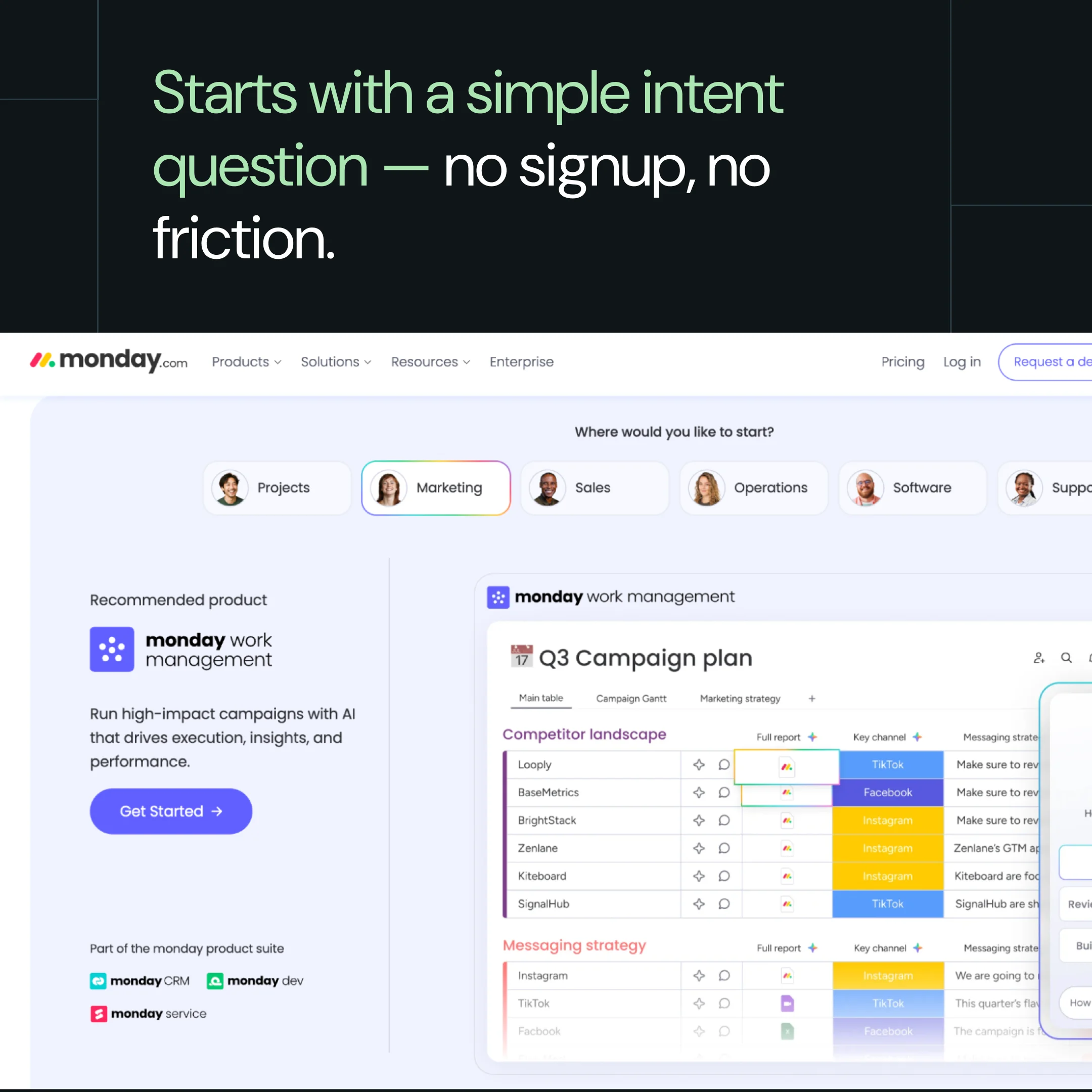 Monday's homepage has an interactive selector that opens with the question: "Where would you like to start?" Visitors choose from roles and use cases, making even low-context (ToFU) users feel oriented right away.