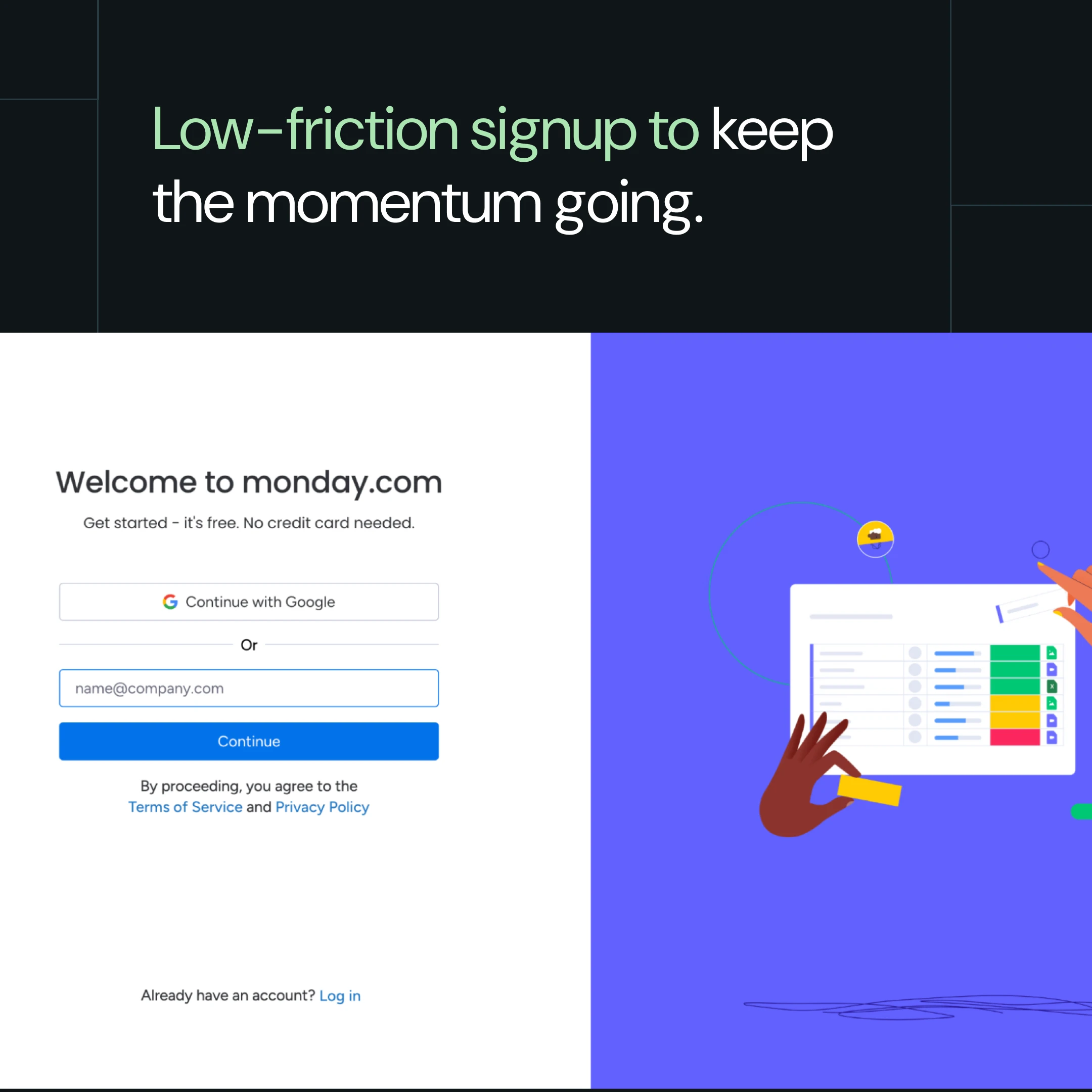Removes the "I need to learn this first" hesitation: ToFU buyers often delay signup, thinking they need to research or watch tutorials first. Monday removes that friction: "Don't worry, we'll set it up for you."