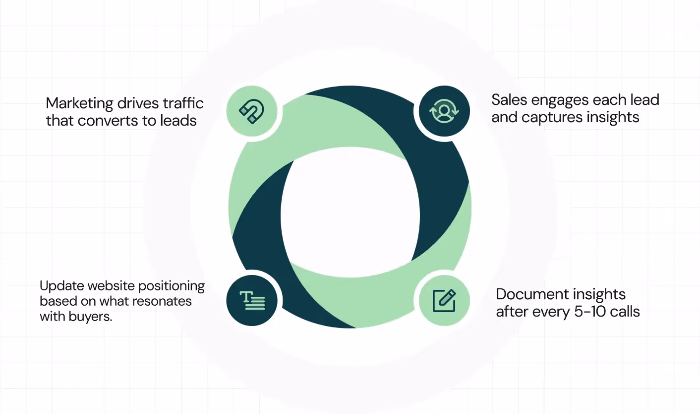 Marketing drives traffic that converts to leads → Sales (or you) engages each lead and captures insights → After every 5-10 calls, insights get documented → Website positioning gets updated based on what's actually resonating with buyers.