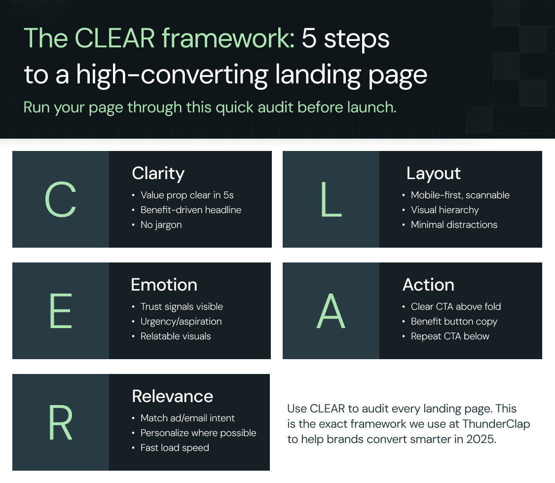 After breaking down the best landing page designs, we don’t want you walking away thinking, “Cool, but what do I do with this?” Inspiration is nice, but execution wins. That’s why we built the CLEAR checklist on the same framework we use at ThunderClap to help brands design landing pages that actually convert.