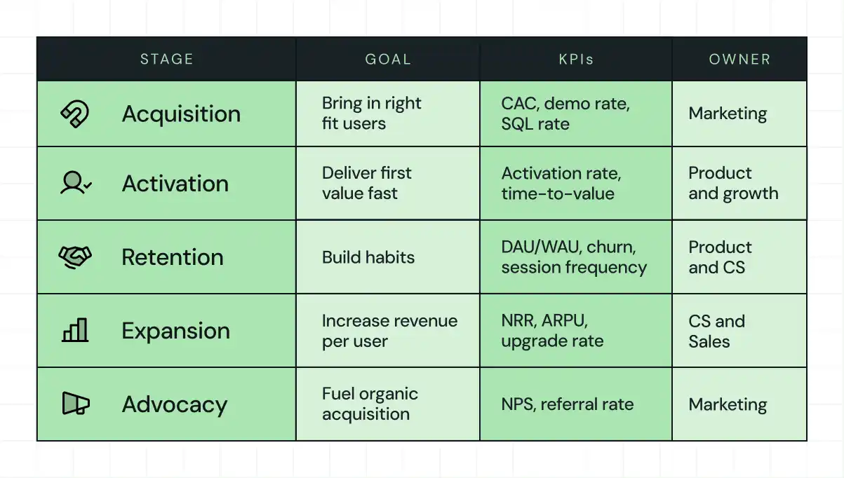 Acquisition → Activation → Retention → Expansion → Advocacy → Back to Acquisition