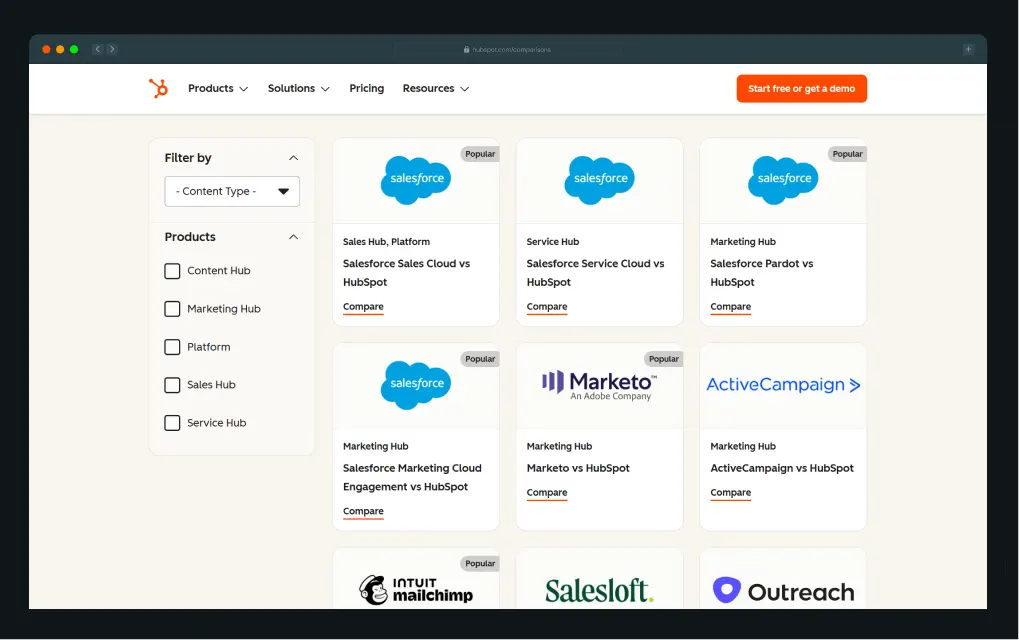 The platform runs dozens of comparison pages, such as “HubSpot vs Salesforce,” “HubSpot vs Zoho,” and more, which let them intercept high-intent traffic from buyers who are already evaluating competitors. Their strategy boosts SEO, builds trust, and drives conversions by making it obvious why many users should pick them over rivals.