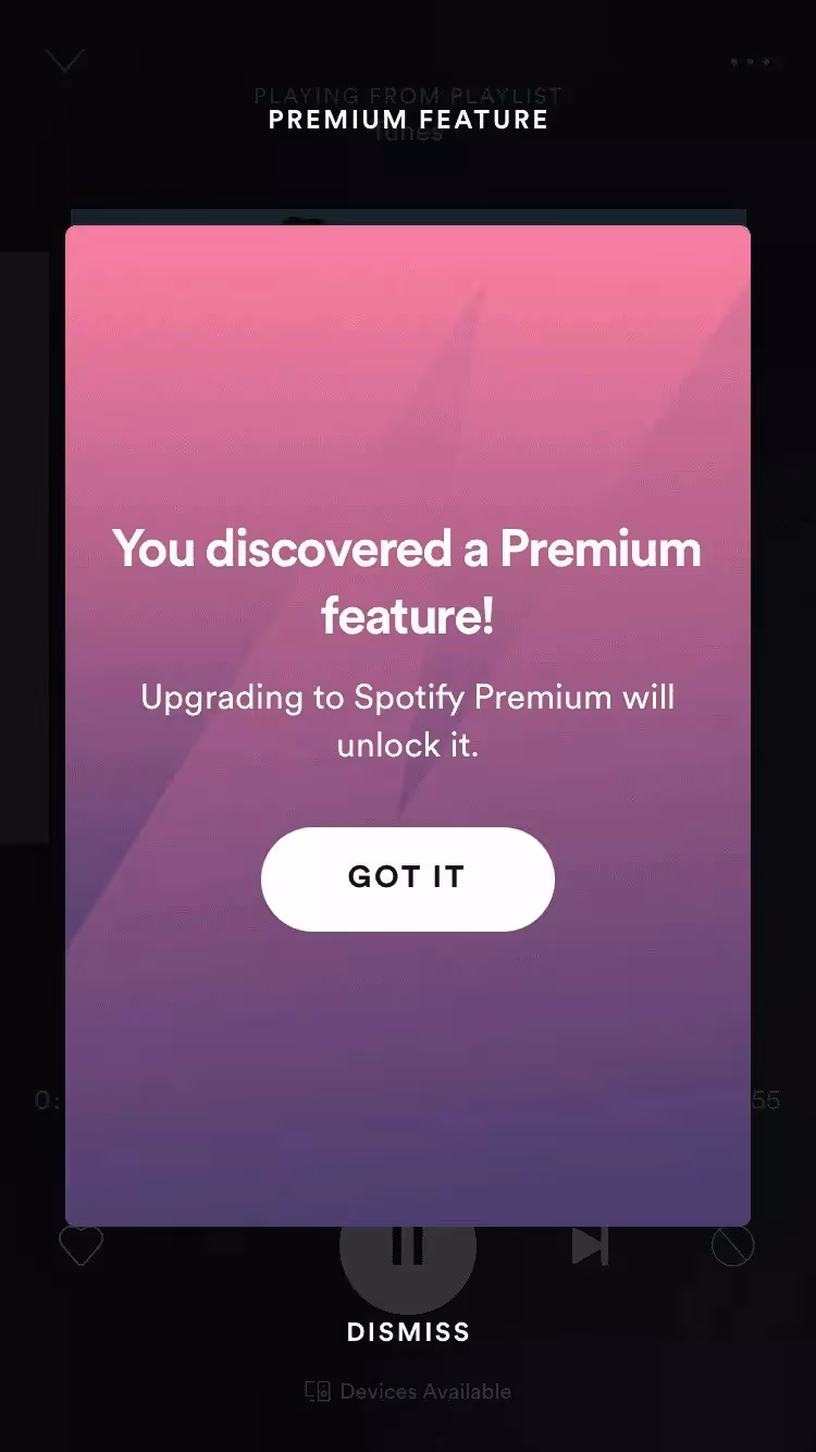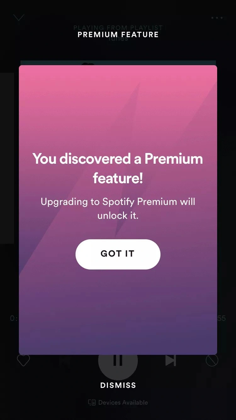 Spotify makes clever use of usage-based upgrade prompts. For free users, skips are capped at 6 per hour, and when they reach this limit, Spotify shows a contextual in‑app message prompting them to upgrade to Premium.