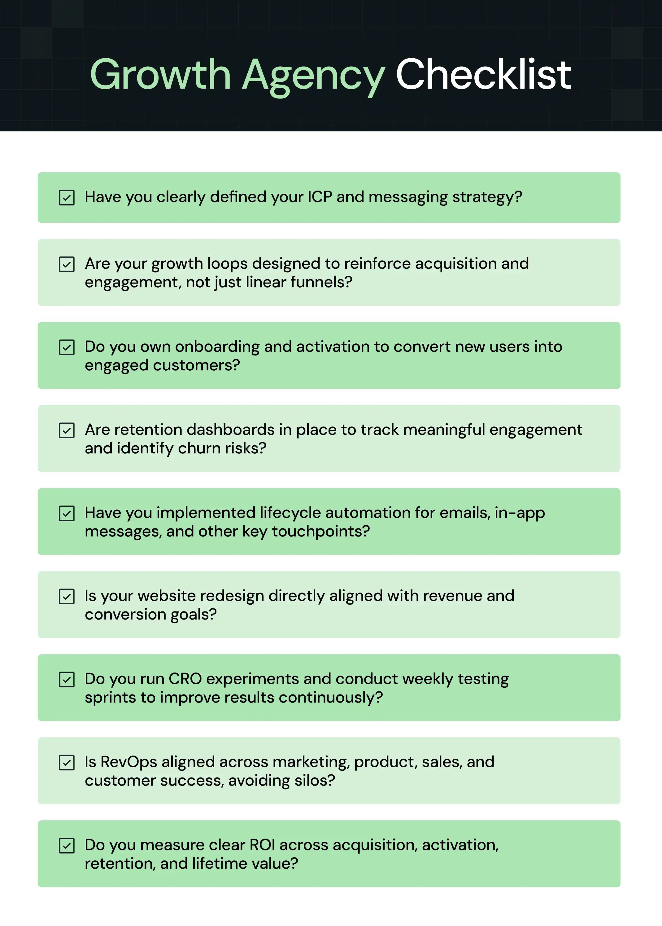 - With acquisition, activation, retention, and expansion working together, growth agencies turn simple lead flow into predictable lifetime value.
