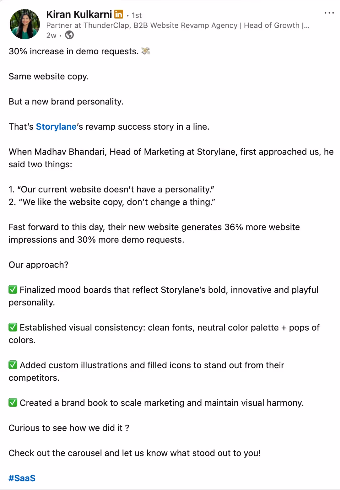 That is the power of thoughtful B2B web design supporting your narrative. Here’s a complete breakdown in this LinkedIn post by Kiran Kulkarni, Partner and Head of Growth at ThunderClap, where she shares the detailed process and before-and-after results.