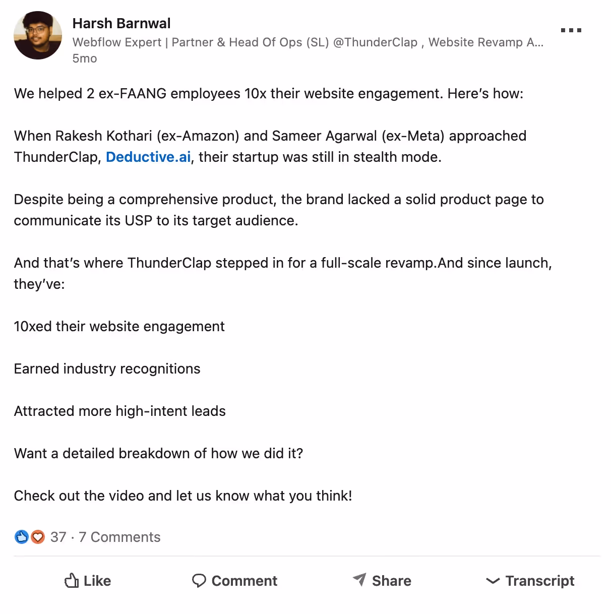After the revamp, the site earned multiple industry recognitions, and engagement jumped 10x. Harsh Barnwal, Partner & Head of Ops at ThunderClap, breaks down the whole process in his LinkedIn post.
