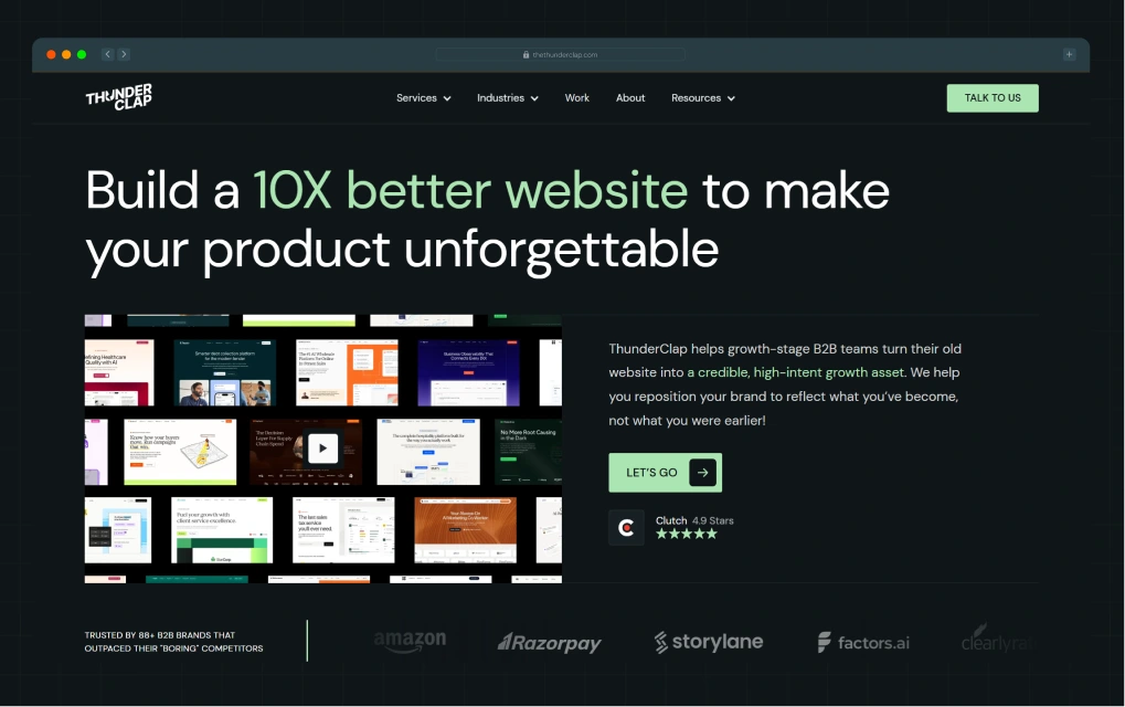 ThunderClap is the Webflow development and B2B web design agency trusted by 88+ fast-growing companies, including Amazon, Storylane, Factors, RoomMaster, Zamp, Dropit, and ClearlyRated. Unlike agencies that focus on aesthetics alone, ThunderClap builds conversion-driven websites for mid-market and enterprise SaaS, fintech, and AI companies that are scaling into new markets or repositioning as category leaders.