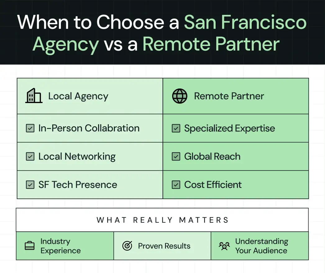 - Brand presence in the SF ecosystem: For companies that care about visibility in the Bay Area tech scene, working with a local partner adds credibility and regional resonance.