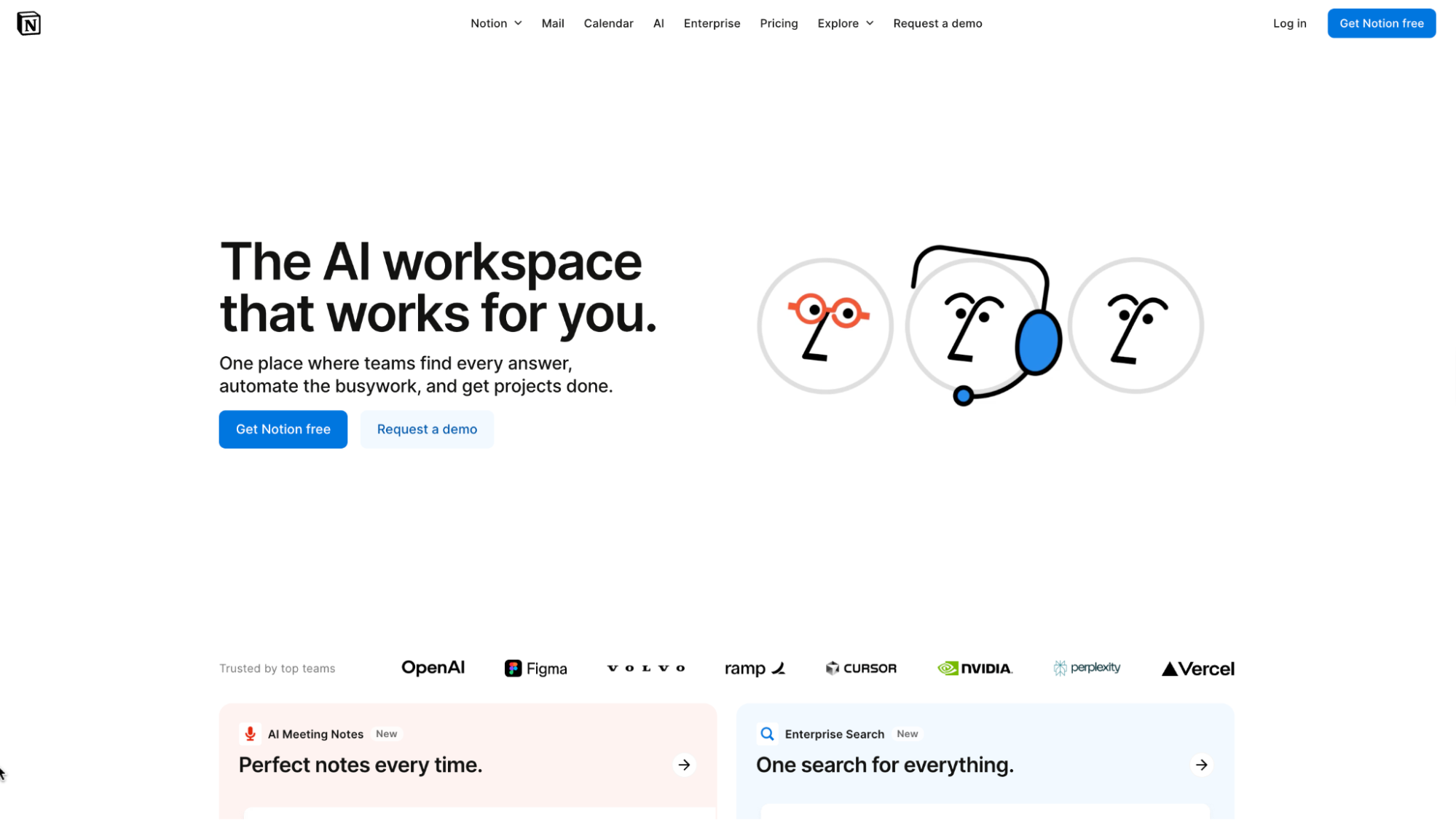 Notion’s earlier site offered multiple navigation paths and CTAs that could pull visitors in different directions. Their current homepage emphasizes one bold primary CTA: Get Notion free. In a PLG (product-led growth) model, one clear CTA reduces friction and drives people directly into the product experience.