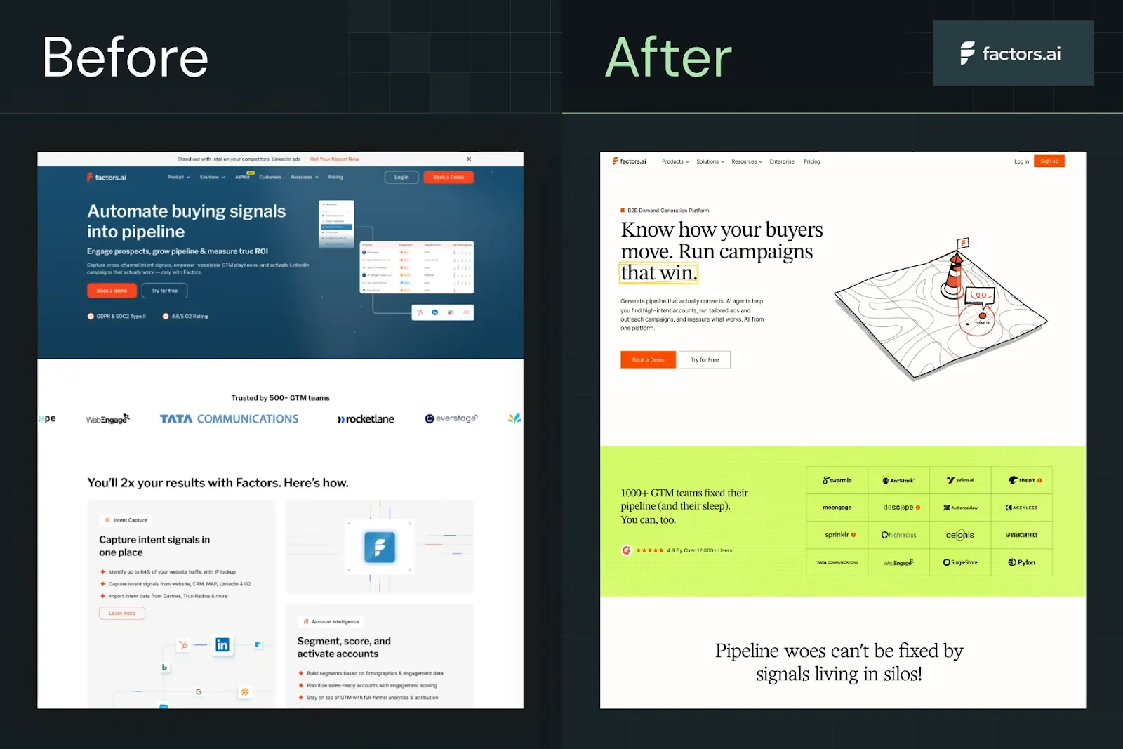The new AI features of Factors.ai weren't getting visibility, messaging wasn't clear, design felt premium but confusing. ThunderClap repositioned features within a clearer value narrative, updated messaging to highlight AI innovation, and redesigned for US market expectations. The revamp resulted in a premium design and clearer positioning, which subsequently attracted higher-quality US-based customers. Thus, sometimes the problem isn't the design. It's that design is fighting against unclear messaging.