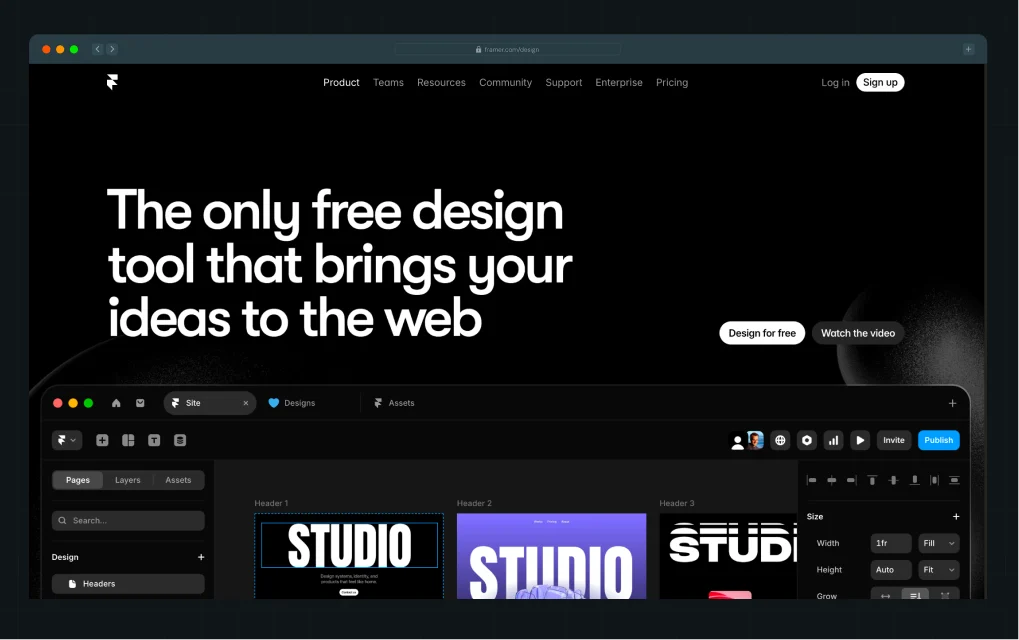 Framer is a visual site builder that prioritizes design freedom, real‑time collaboration, and smooth animations. It lets teams work together on the canvas in real time and build highly interactive pages without complex setup. Framer’s interface feels more like a design tool than a traditional builder, with intuitive layout controls and seamless Figma import.