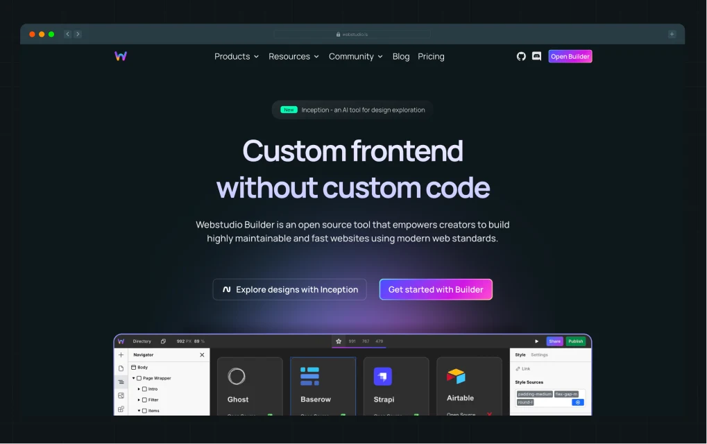 Webstudio is a visual frontend‑as‑a‑service platform that mirrors a Webflow‑like editing experience while being open source and backend‑agnostic. Designers and developers can visually create pages and self‑host them or integrate them with any backend, rather than being tied to a proprietary ecosystem.