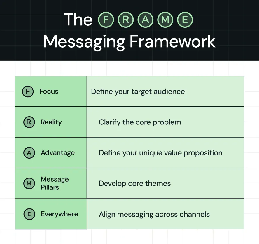 F.R.A.M.E. = Focus → Reality → Advantage → Message Pillars → Everywhere