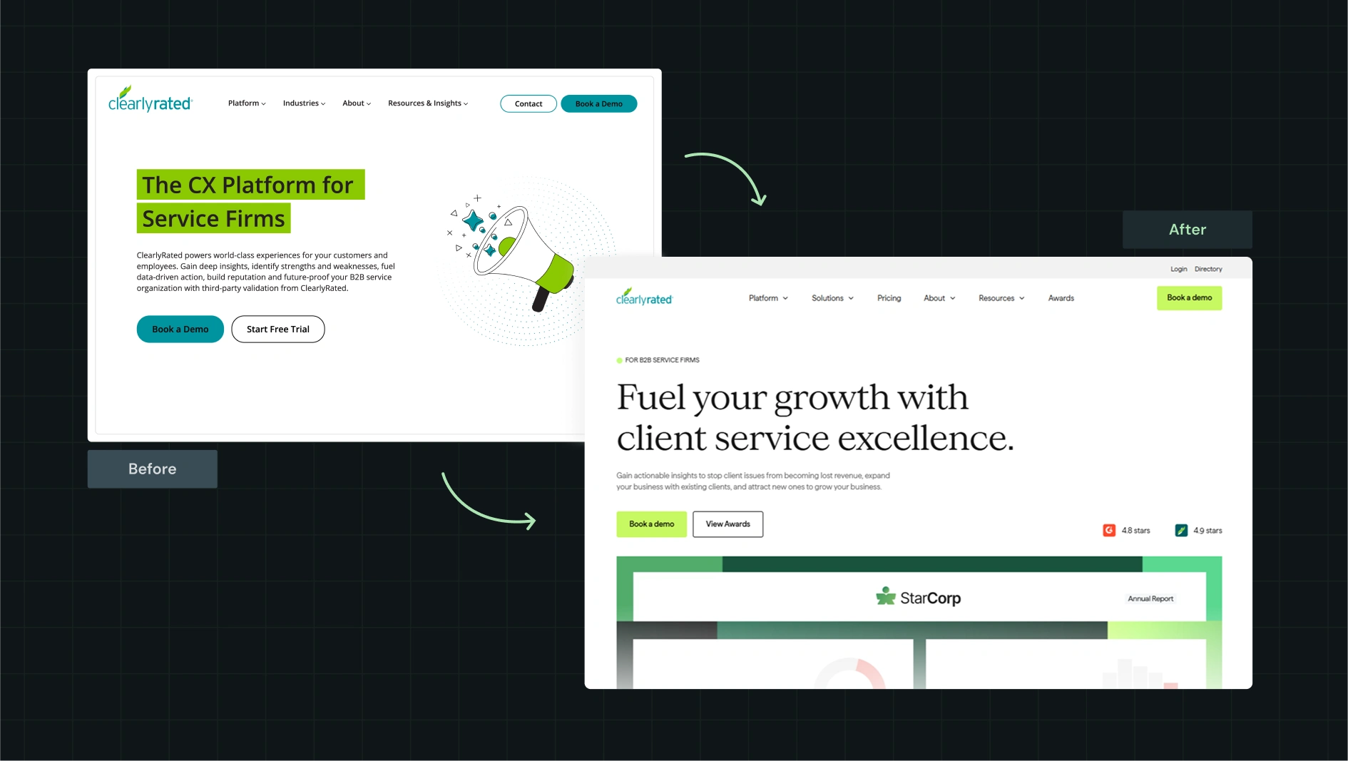 For example, when we redesigned the ClearlyRated website, we worked closely with sales, marketing, and product teams to clarify messaging and restructure key pages so visitors could immediately understand the product’s value.